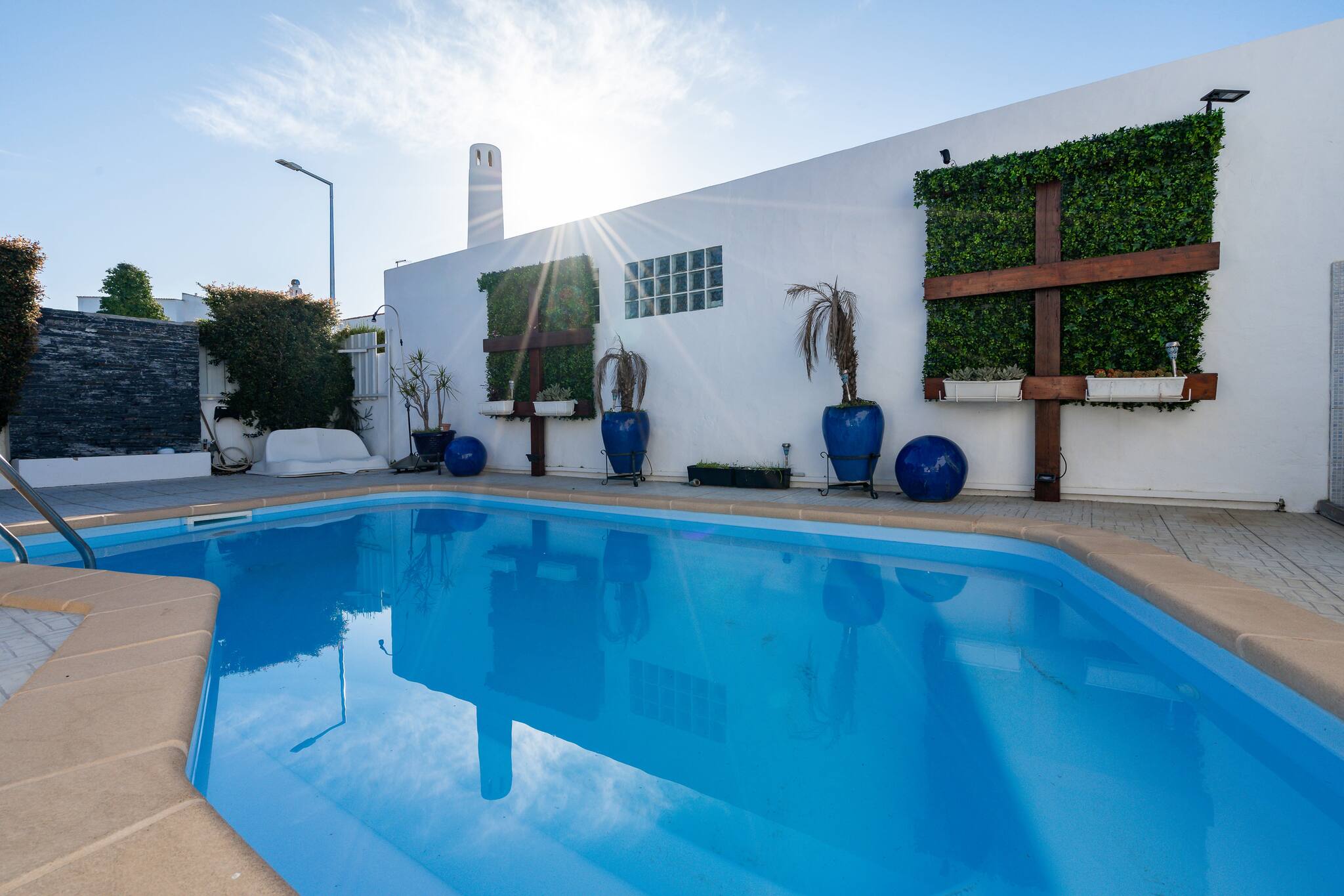 O espaço exterior é muito convidativo com uma piscina bonita, um sofá grande para relaxar e uma mesa e cadeiras para refeições ao ar livre.