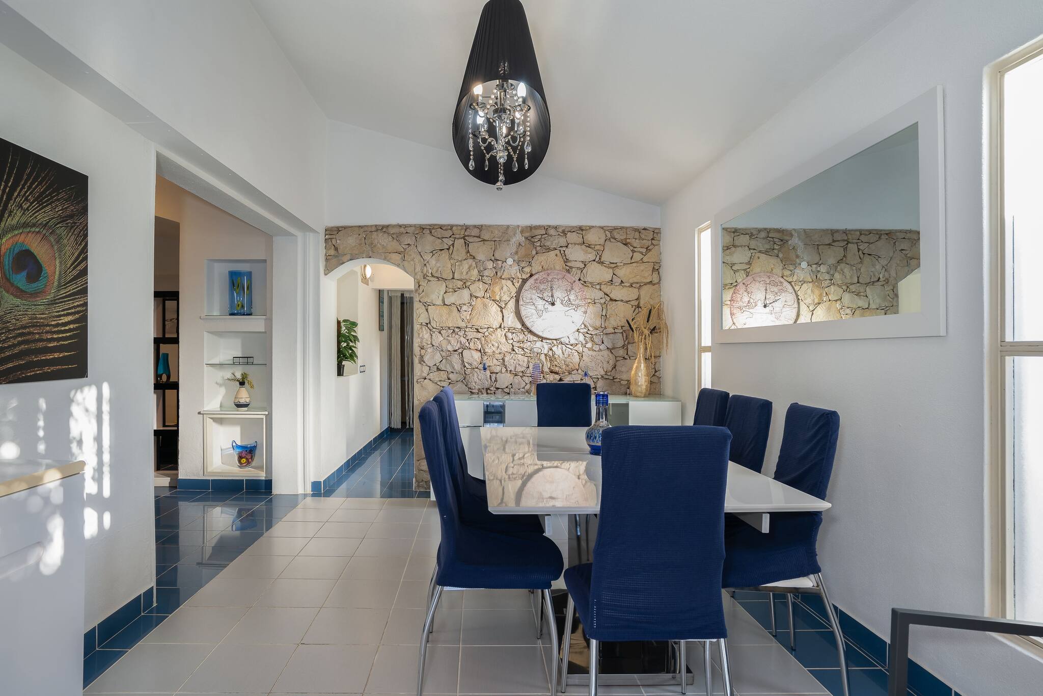 A vivenda consiste, no rés-do-chão, numa grande sala de estar/jantar com acesso ao jardim e à piscina privativa, uma cozinha muito bem equipada, uma casa de banho de serviço e um quarto espaçoso com casa de banho privativa. No primeiro andar existem dois quartos com uma varanda com vista para a piscina e uma casa de banho.