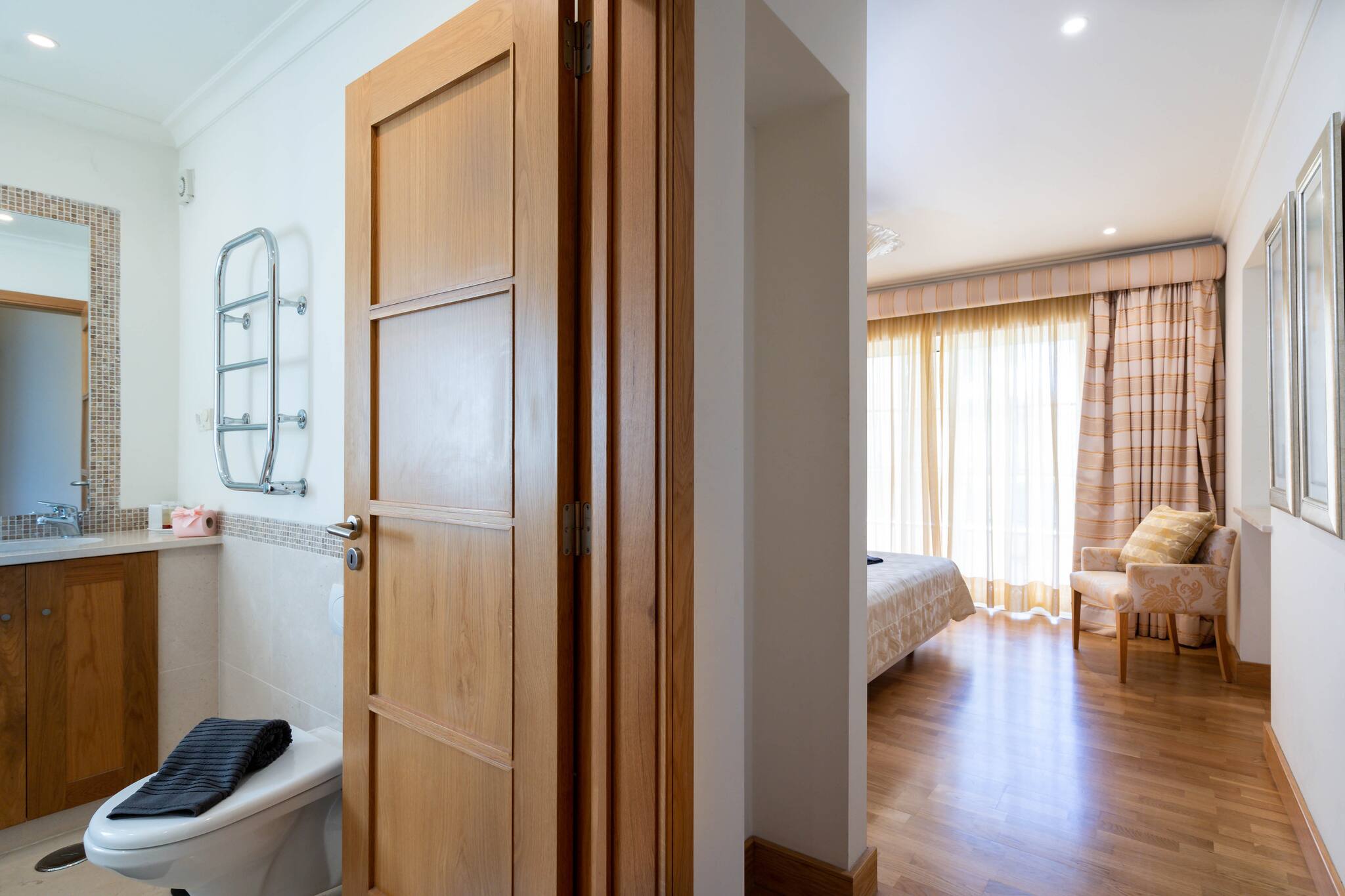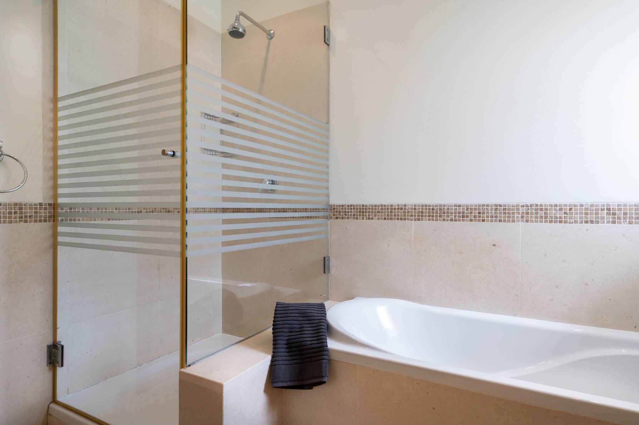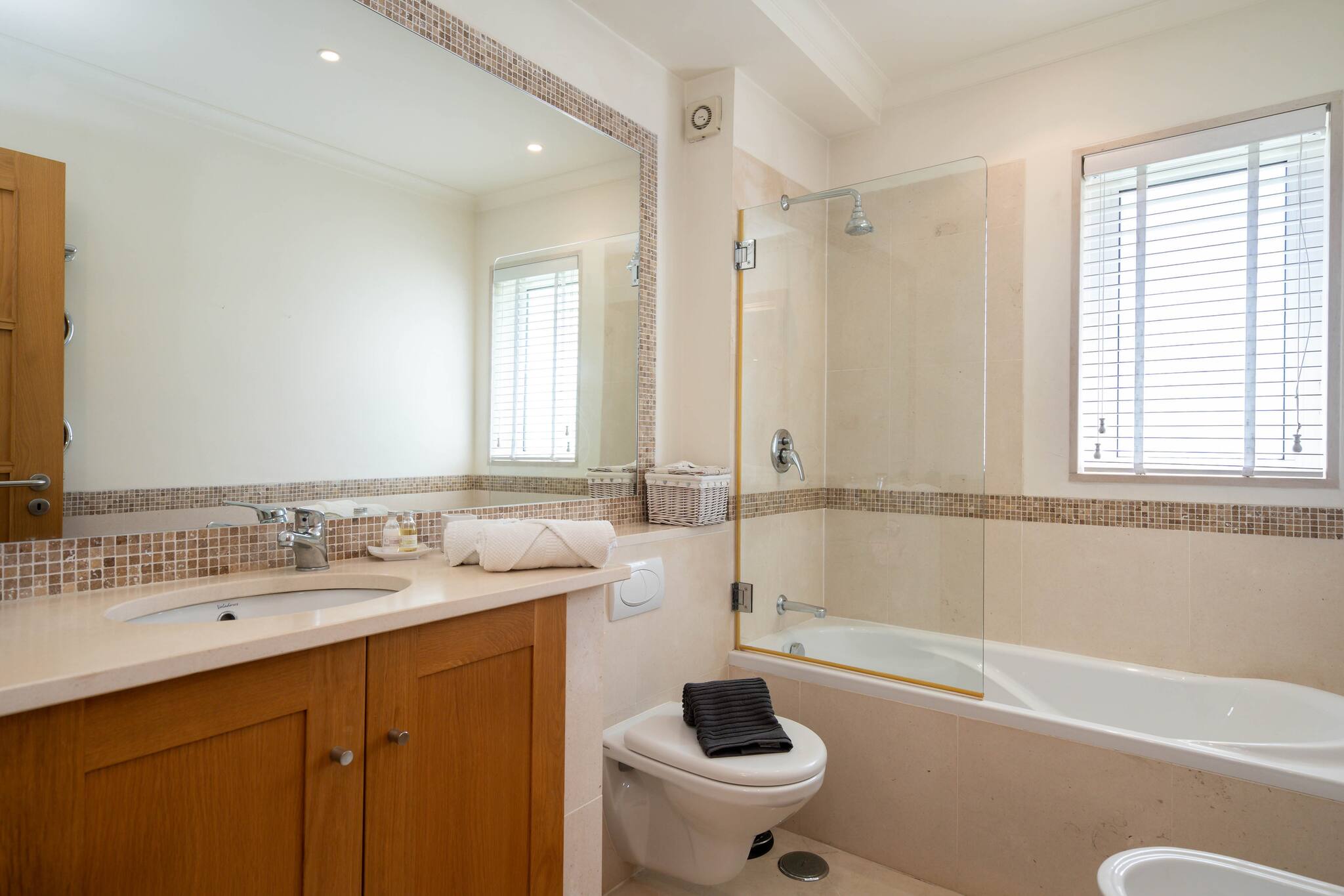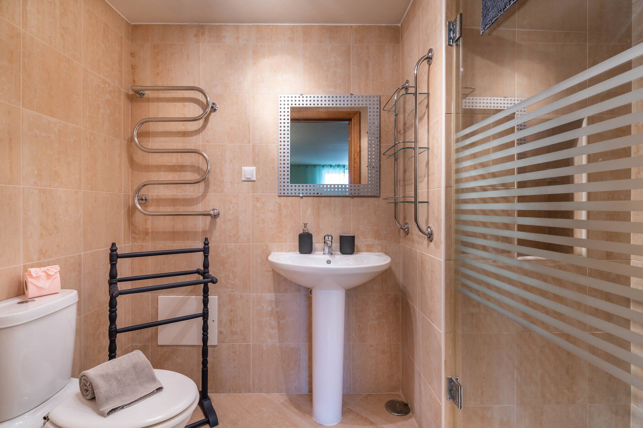 Next to the living room are two bedrooms and a bathroom. The two bedrooms on this floor are furnished with a double bed. One of the bedrooms has a private bathroom with a shower and bathtub.