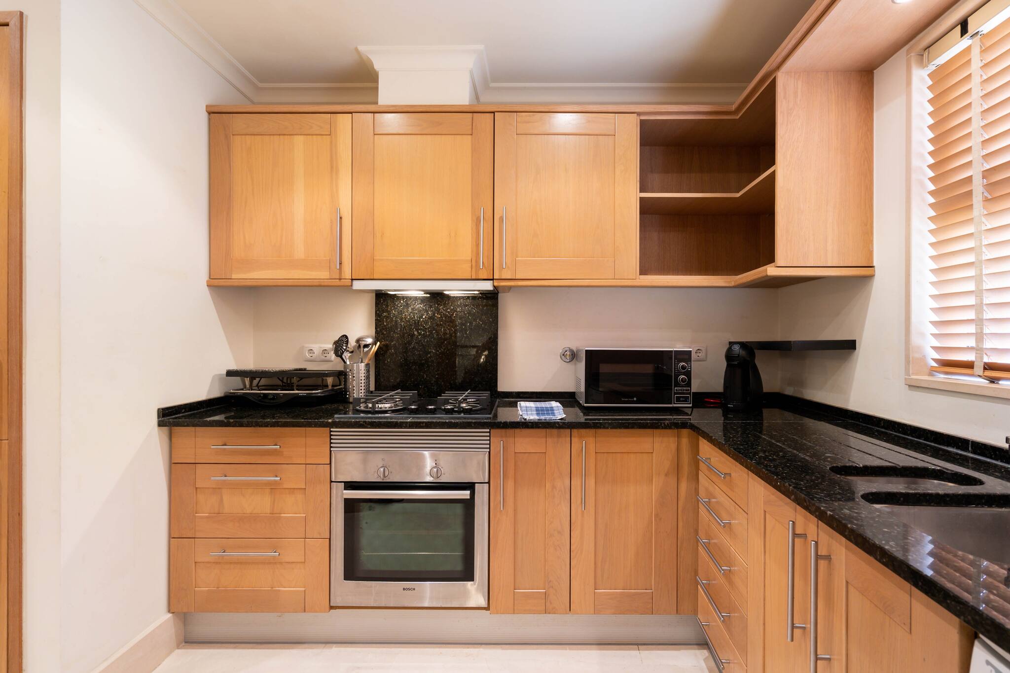 Upon opening the front door of the apartment you will find an entrance hall. To the right, the fully equipped kitchen with washing machine, dishwasher, oven, coffee machine, etc. and with granite counter tops. The kitchen has a direct passage to the living/dining room.